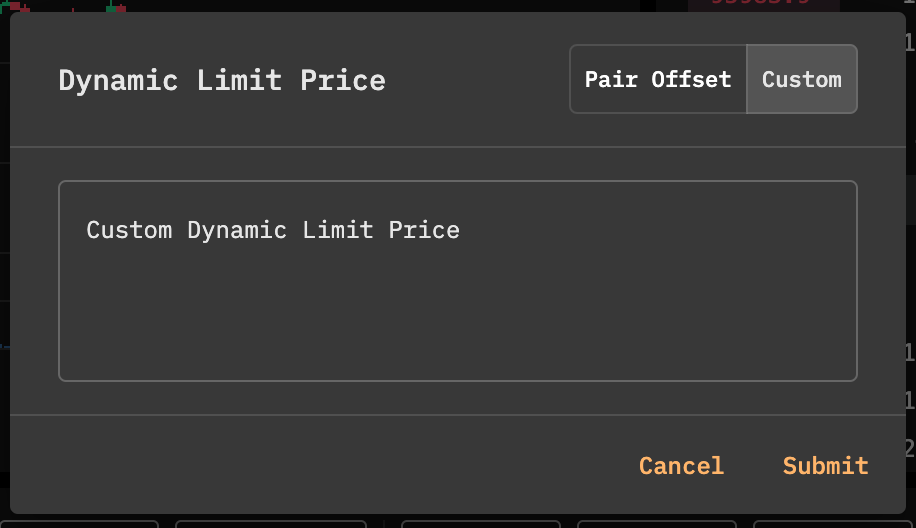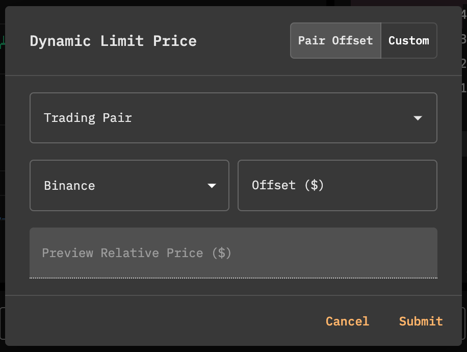 Traders can configure a Dynamic Limit Price using two modes: Pair Offset and Custom.