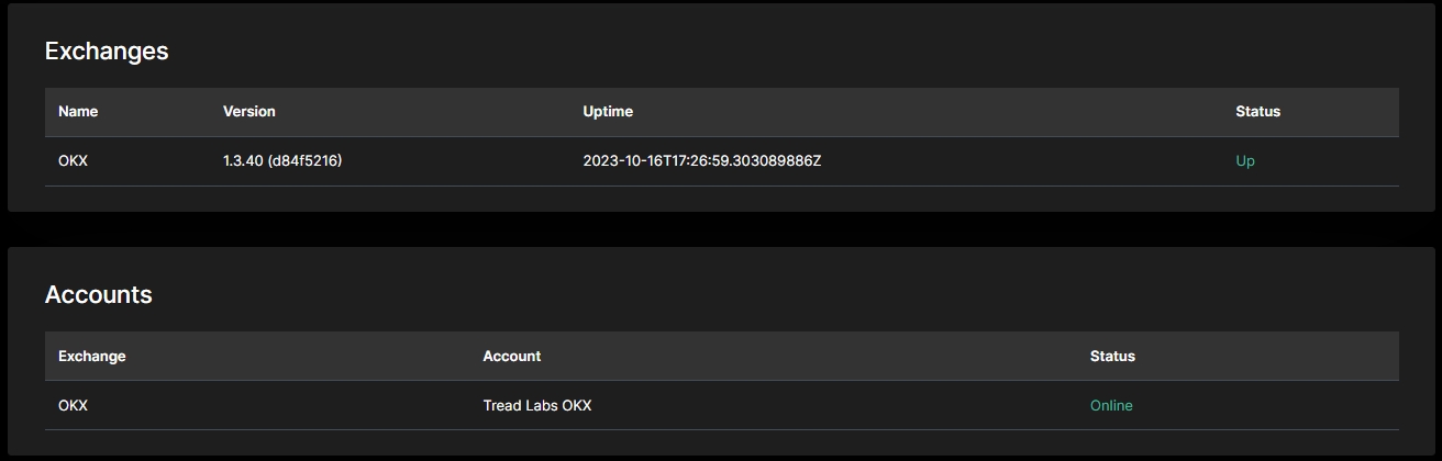 Exchanges show the status of the exchange adapters connected to each exchange. These are shared by all users within the client's organization. Accounts show the status of each of the exchange accounts. For example: