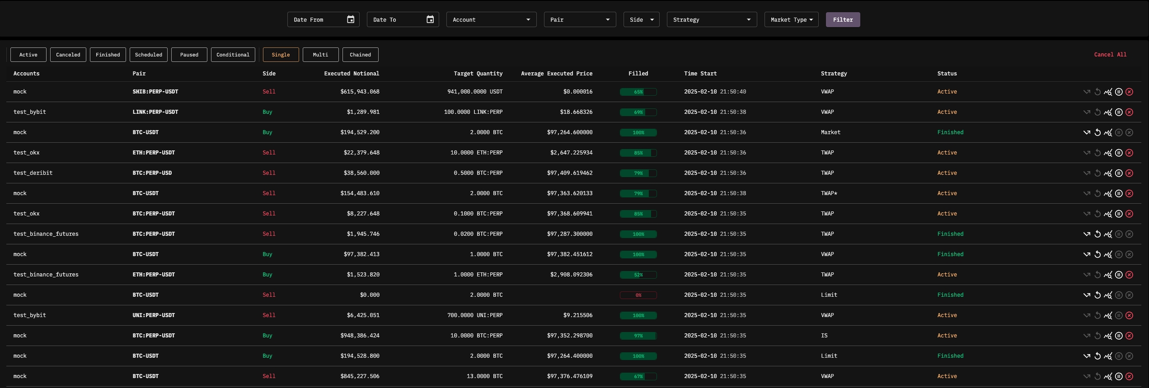 Order Filtering – Traders can refine search results using filters such as Date Range, Account, Trading Pair, Side, Strategy, Market Type, and more.