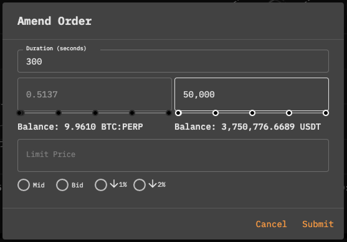 The Amend Orders feature allows traders to modify specific parameters of an active order, providing flexibility to adjust execution strategies without canceling and resubmitting.