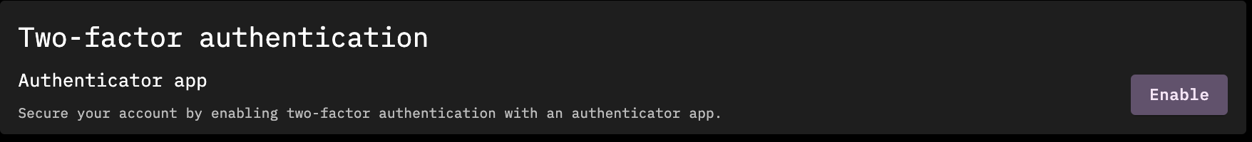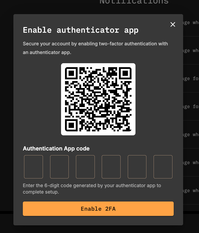 After installing an authenticator app on your phone, click Enable and you'll be presented with the dialog below. You'll need to scan the QR code with your phone and enter the six digit code that results. Subsequent logins from the same device will usually require just a username and password, but you'll occasionally be asked to enter a code from your authenticator app.
