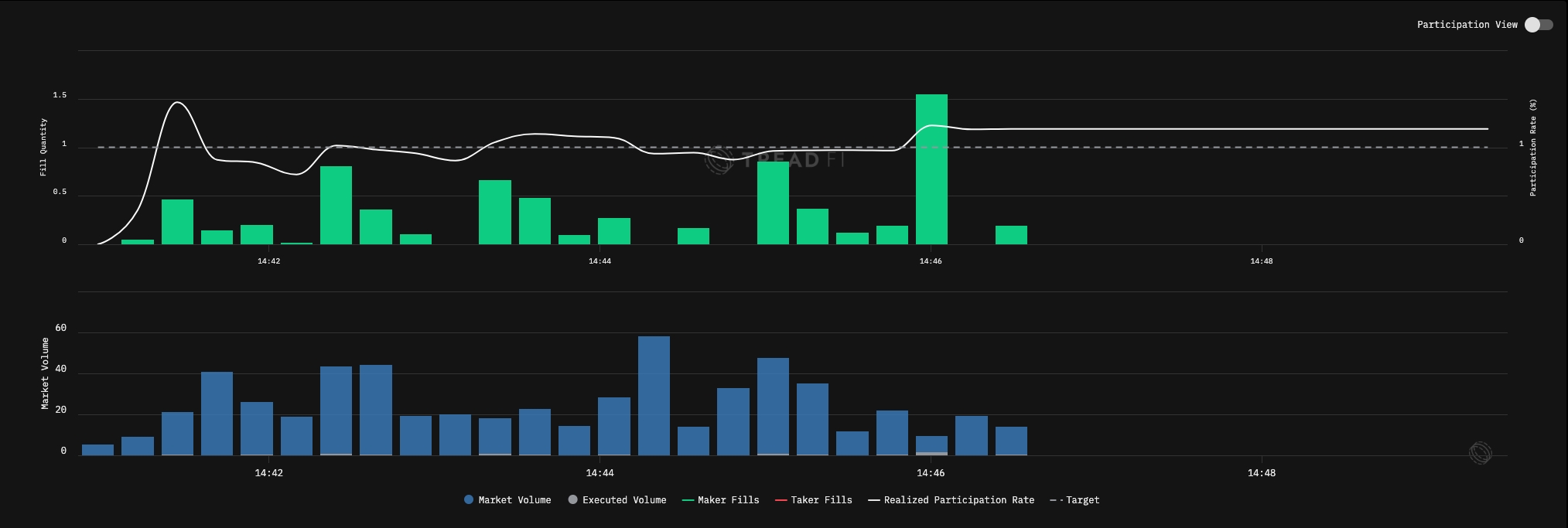 It only resorts to urgent 'taker' fills if the execution falls seignificantly behind schedule, or in other words, breaches the lower discretionary bound. In short, the goal of this strategy is: be passive first, only become aggressive when necessary to stay on track.